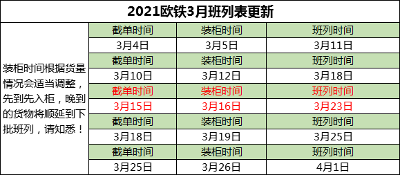 新增3月23日班列,3月16日裝柜(即處理到3月11日-15日到我司的貨物)。我司走的是圖定班列,每周班列發車時間有保證,時效穩定,到達荷郵提取時效是裝柜后26-28天。請廣大客戶知悉,謝謝!