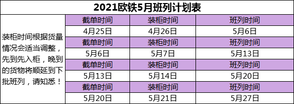 關(guān)于我司歐鐵荷郵小包渠道2021年5月份班列截開(kāi)時(shí)間安排如下表(截單時(shí)間表示當(dāng)天到的貨會(huì)處理),我司走的是圖定班列,每周班列發(fā)車時(shí)間有保證,時(shí)效穩(wěn)定,到達(dá)荷郵提取時(shí)效是裝柜后28-30天。請(qǐng)廣大客戶知悉,謝謝!